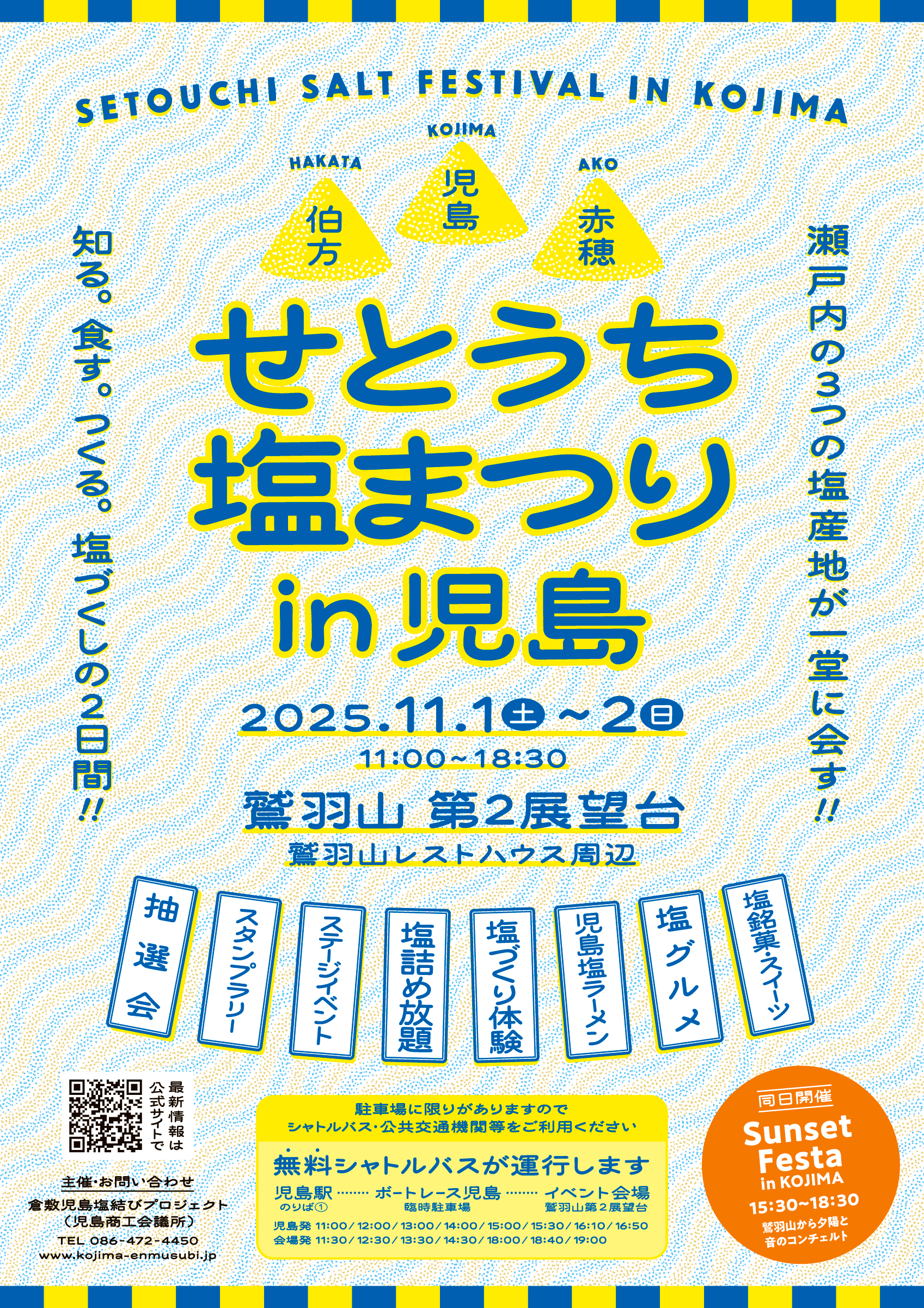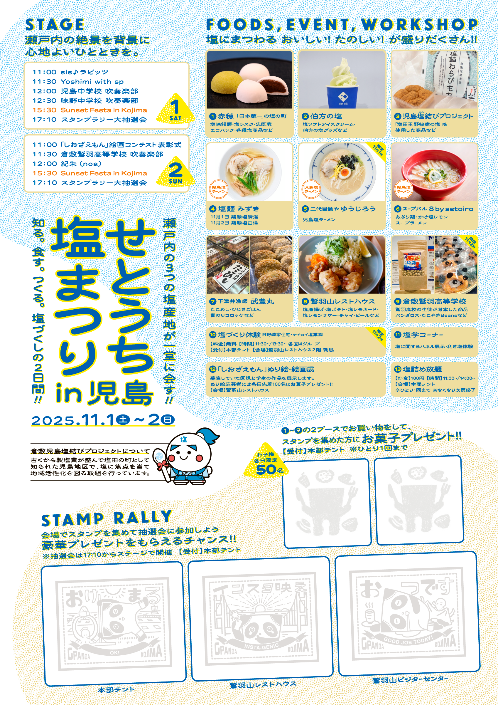 イベントではスタンプラリー・塩詰め放題・塩づくり体験(11/2のみ)・抽選会と盛りだくさんです。