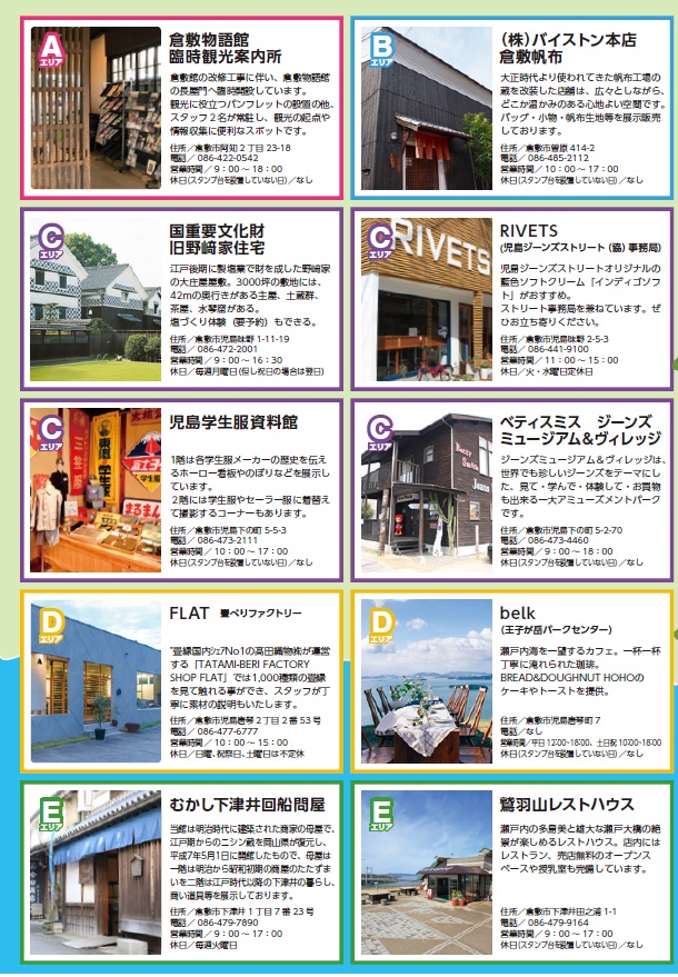 スタンプラリー用パンフレット並びに応募用紙は、児島や倉敷等の観光案内所や各スタンプ台設置場所(10ヶ所)にご用意しております。