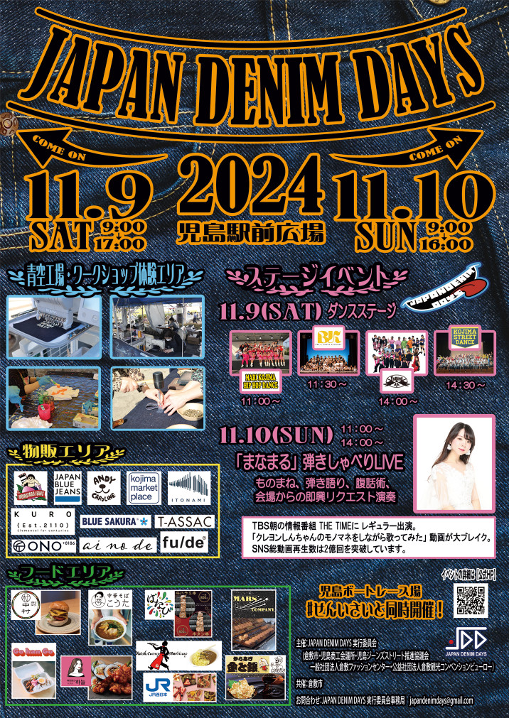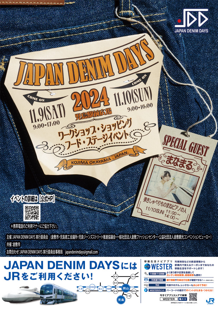 2024年11月9日(土)・10日(日)の2日間、JR児島駅前西口広場にて、国内最大級の体験型デニムイベント「JAPAN DENIM DAYS」を開催いたします。「2024秋 児島フェス #せんいさい」と同日開催!! 10(テン)⽉26(ニム)⽇のデニムの⽇にあわせ、職⼈の技術に触れる機会として加⼯体験に加え、企画体験としてオリジナルジーンズのオーダー(予約制)や、職⼈の中でも特に⾼い技術を持つ「繊維マイスター」の仕事を⾝近で⾒学できる⻘空⼯場も設置しての開催となります。家族で楽しめる無料企画体験・加工体験・グルメエリアも設置しておりますので、皆様お楽しみに!!