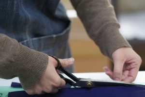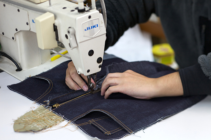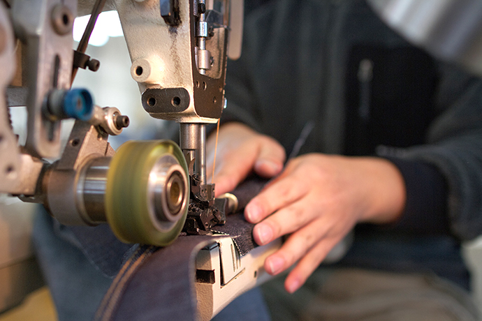 児島ではヴィンテージジーンズ同様、綿糸を使って縫製している。ポリエステル糸では、エイジングの際、糸だけが奇麗なままで浮いたような印象になってしまうからだ。糸の種類も様々。○番手の極太糸にこだわるブランドもあれば、ヴィンテージデニムの鮮やかなオレンジを活かしたブランド、チェーンステッチではなくあえて手動でグルグルとステッチをかけるブランドなど、縫製は衣服の肝であるだけに、細かなところまで各々こだわりぬかれている。特に味のある仕上がりを求める需要が高いため、ユニオンスペシャルというヴィンテージジーンズを縫っていたミシン(稀少なため時価百万をこえるという!)で「ネジレ」「ヨジレ」を再現しているブランドもある。
