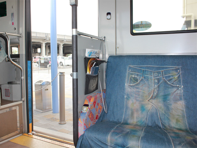外見は今までのジーンズバスと変わりませんが、乗車した瞬間、そこはまるでジーンズミュージアム!いたるところにデニムが使用されていたり、いろんな展示物があり、驚きの空間になっています。是非、ご乗車ください。
