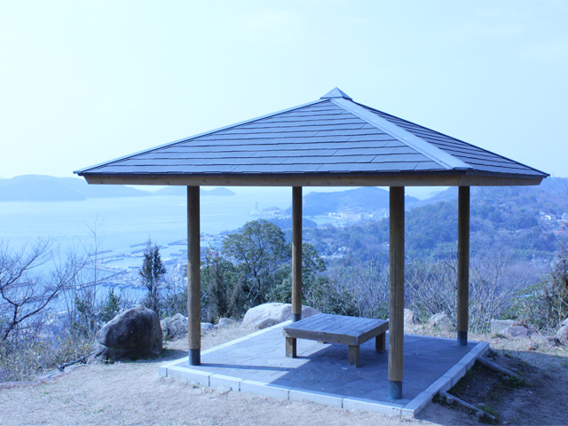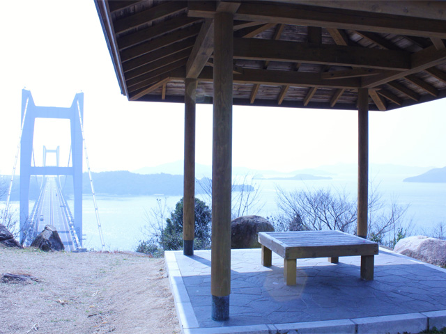 鷲羽山レストハウスから遊歩道を20分ほど登ると東屋があり、そこからは、瀬戸大橋を真下にご覧いただくことができます。橋脚の間を真っ直ぐに走る舗装路と瀬戸内海とのコントラストは、ほかでは味わえない眺望です。