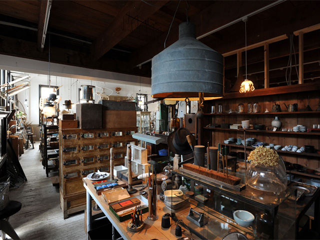 ジーンズストリートのほぼ中央にある「旧銀行跡」をリノベーションした古道具屋Womb(ウーム)。 店内に所狭しと並ぶのはインダストリアルな家具から雑貨まで・・・日本の工業系古道具を中心としている。 廃材などを再構築、古時計を蘇生するブランドtestisのアイテムも並ぶ。