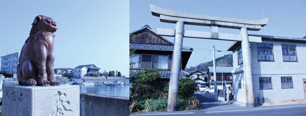 田の口港の大鳥居は由加神社の南参道の入口にあたります。現在は陸上にある大鳥居ですが昔、海の中にありました。両参りの参拝者はここで船を降り約7kmの道のりを歩いて由加山へ参拝をしました。大鳥居前の狛犬は由加神社本宮の狛犬と同様に備前焼で作られています。